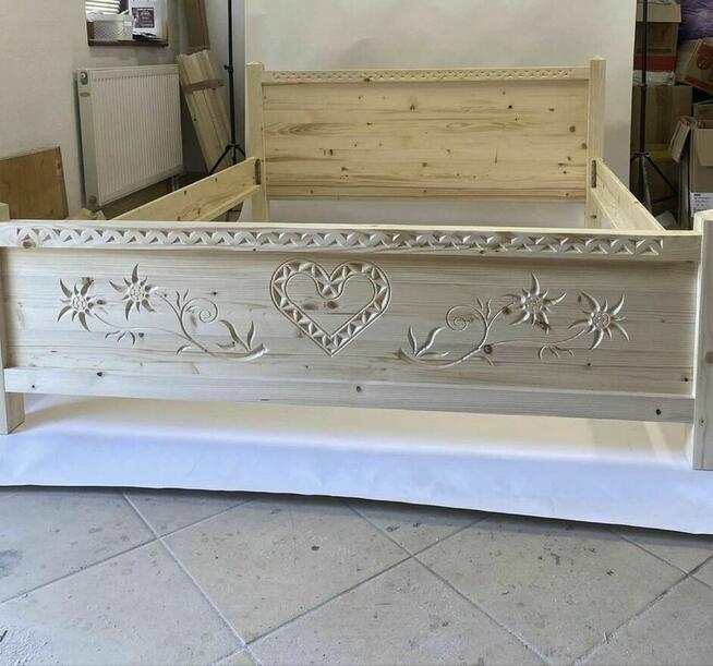 Drewniane łóżko w stylu góralskim z motywem serca. Wykonane z drewna świerkowego lub sosnowego, Łóżko jest nowe i ...